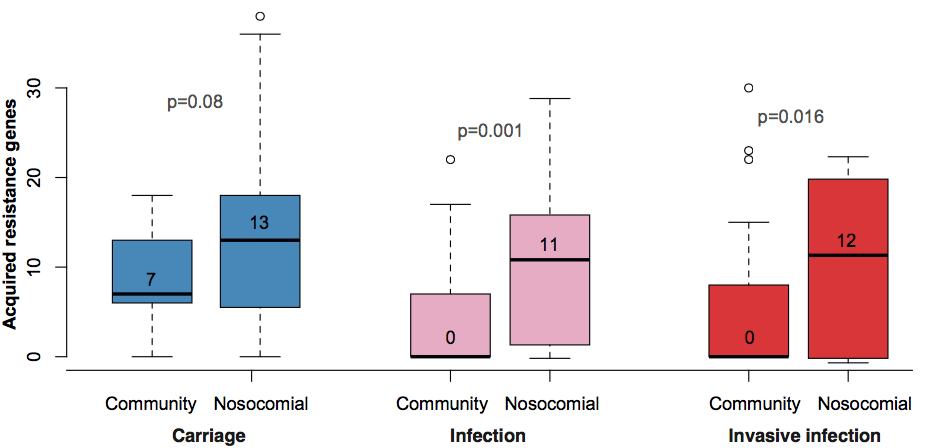 We found >40 different acquired AMR genes in the genomes, and also point mutations that are known to be associated with resistance to fluoroquinolones (in gyrA, parC) or nitrofurantoin (nfsA). Notably there was no difference between AMR rates in cases and controls, even at the level of individual genes:
